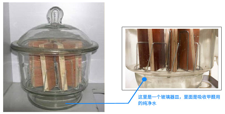 你看看上面那張表,表中的《人造板及其制品用甲醛清除劑清除能力的測試方法》,這個方法是檢測人造板甲醛釋放量方法,專業(yè)上稱之為“干燥器法”。就是把10塊切割成15cm×5cm的人造板,放到這個10升的玻璃容器里,密閉24小時。24小時中,人造板不停地釋放甲醛,在玻璃容器的底部,放著一個盛著純凈水的玻璃器皿,人造板釋放出來的甲醛被吸收在水中,然后檢測水中的甲醛,所得數(shù)值就是人造板甲醛釋放量。