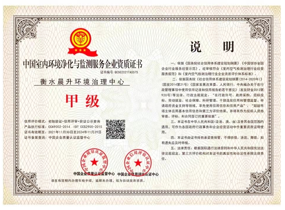 室內(nèi)環(huán)境污染治理資質(zhì)等級證書